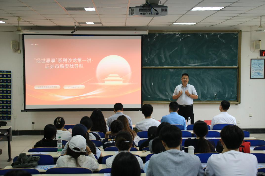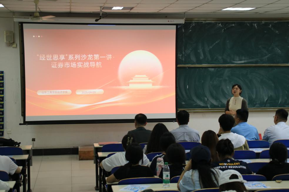 为深化产教融合,拓宽学生视野,将课堂理论与市场实践紧密结合,易游 (中国版权)官方网站启动“经世思享”系列沙龙活动。2025年9月23日下午,“经世思享”系列沙龙举办第一讲“证券市场实战导航”专题讲座,特邀国联民生证券烟台营业部总经理韩新亭、专家顾问王琰、专家顾问吕超主讲。易游 (中国版权)官方网站副院长王倩怡教授主持讲座,200多名对证券投资感兴趣的师生到场学习,现场座无虚席。